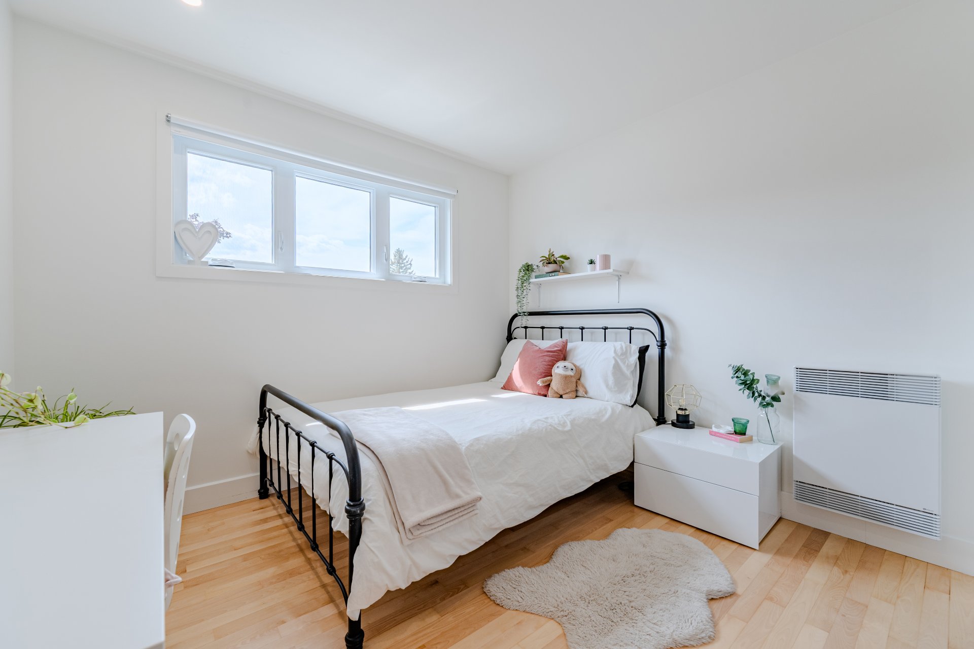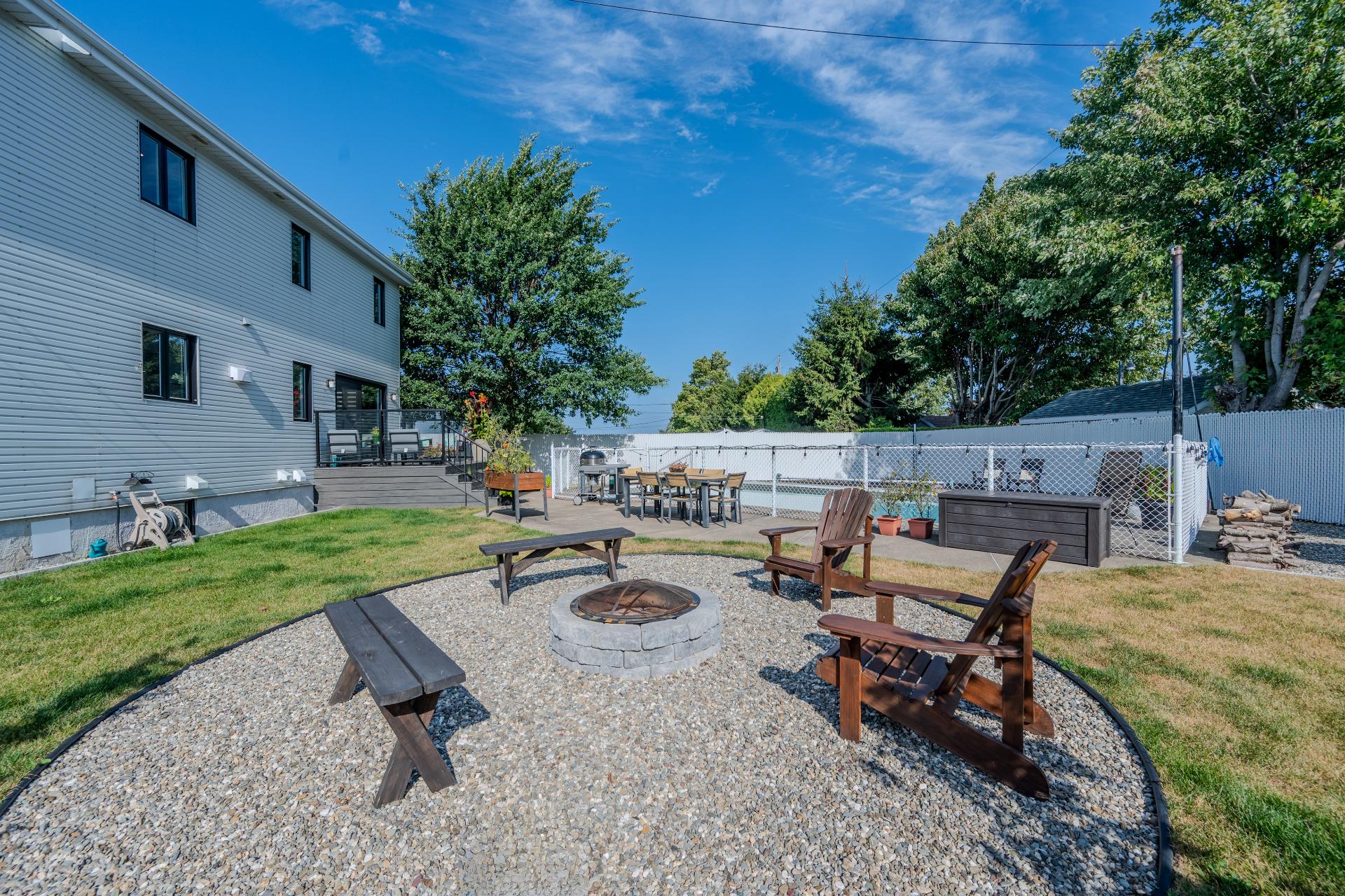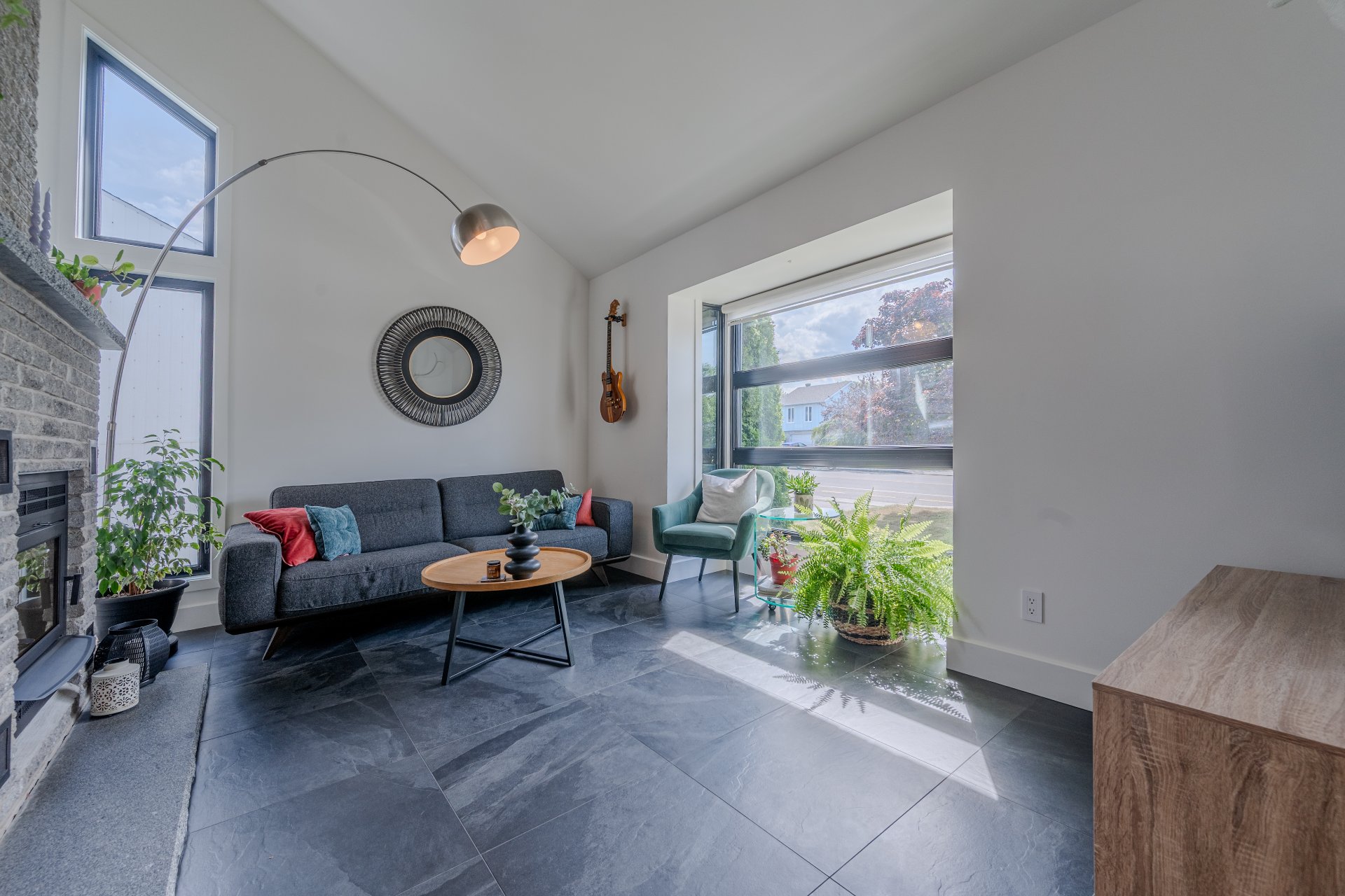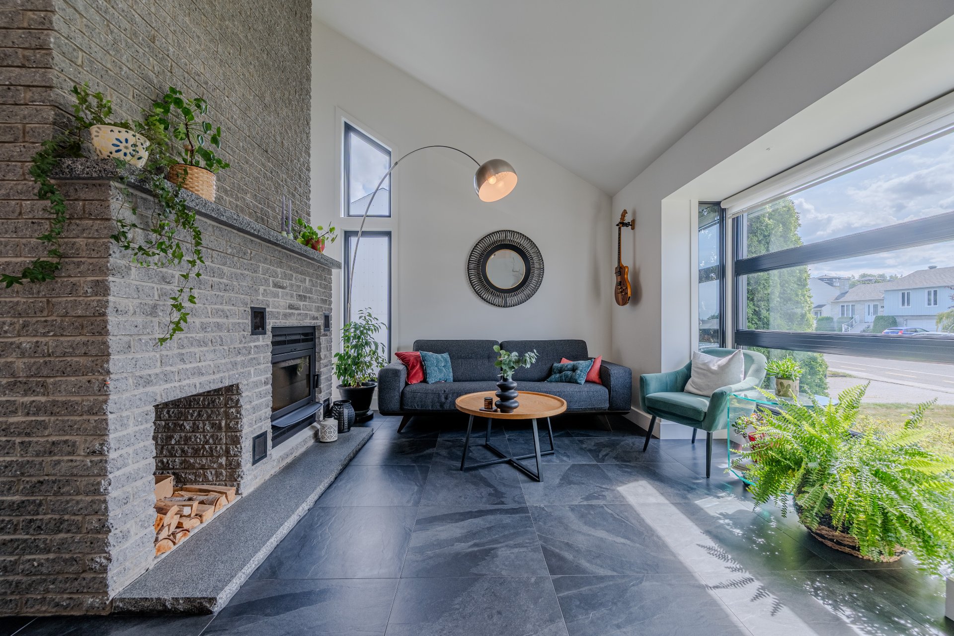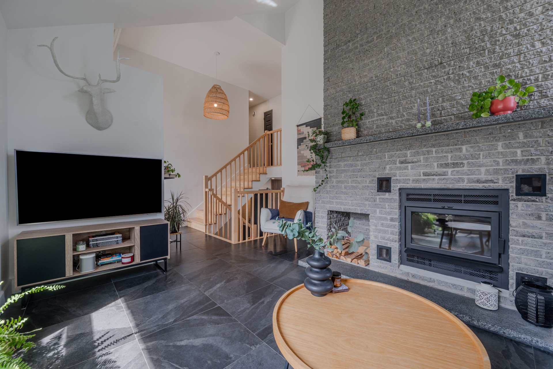Aménagement intérieur * Palier supérieur : 4 chambres sur un même niveau, dont une suite des maîtres avec walk-in et salle de bain privée. Deuxième salle de bain complète avec douche moderne et bain autoportant. Garde-robe de type penderie avec chute à linge intégrée menant directement à la salle de lavage au sous-sol. * Palier d'entrée : vaste hall avec garde-robe et salon lumineux doté d'une vaste fenestration, d'un plafond cathédral et d'un foyer à bois (2023) dans un manteau de brique élégant. * Palier cuisine / salle à manger : espace moderne avec cuisine rénovée, comptoirs en quartz, îlot central, salle à manger, coin dînette et salle d'eau. Planchers chauffants sur tout le palier. Grande porte-patio de 8 pieds donnant accès à la cour arrière.