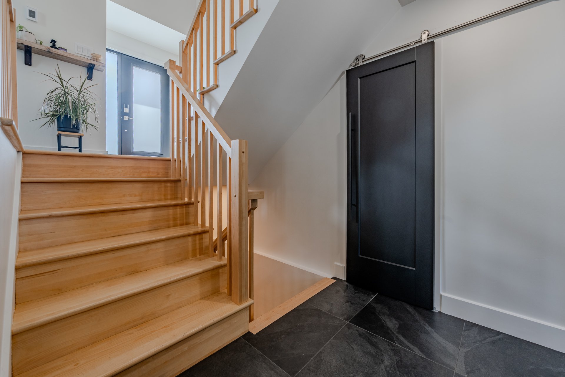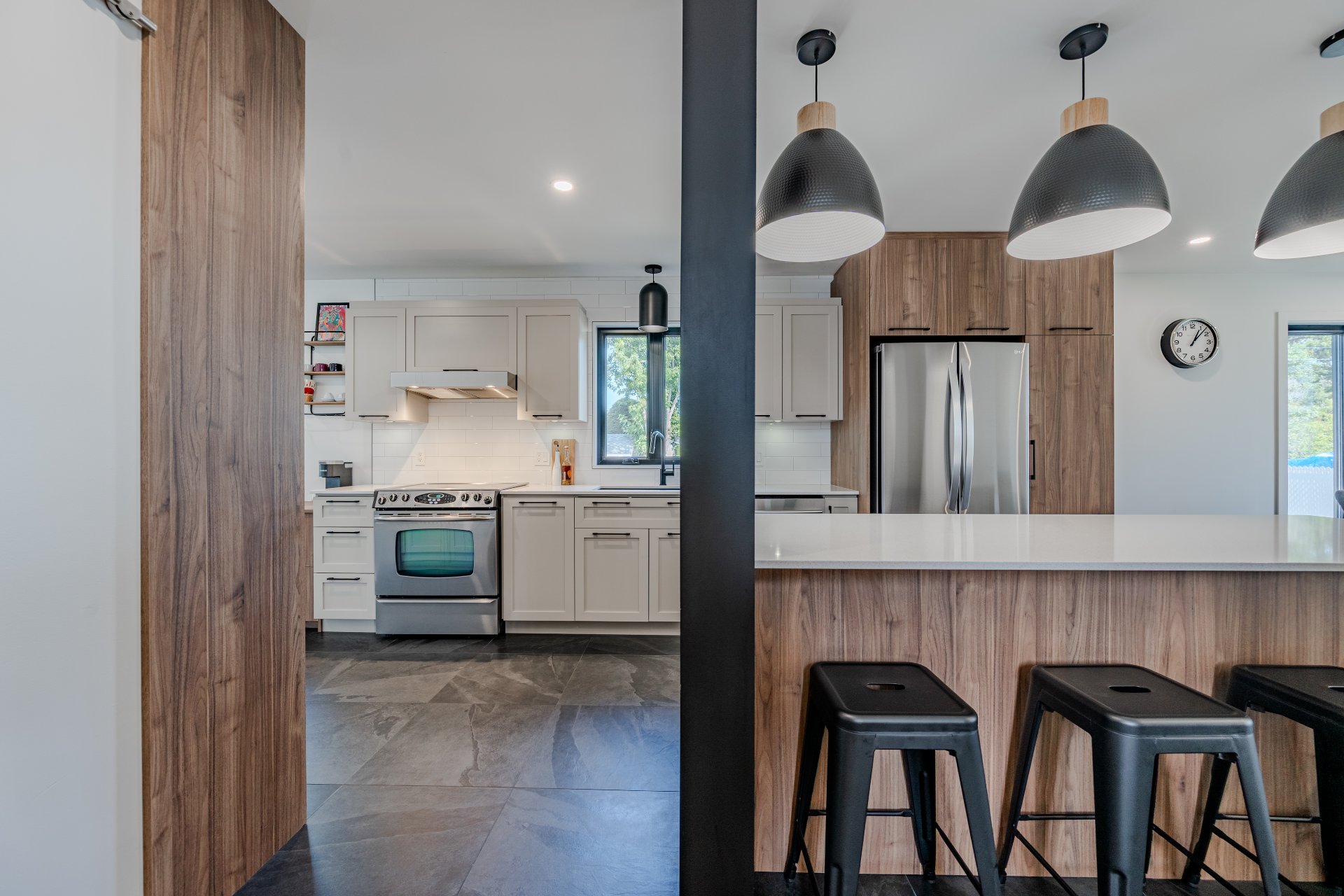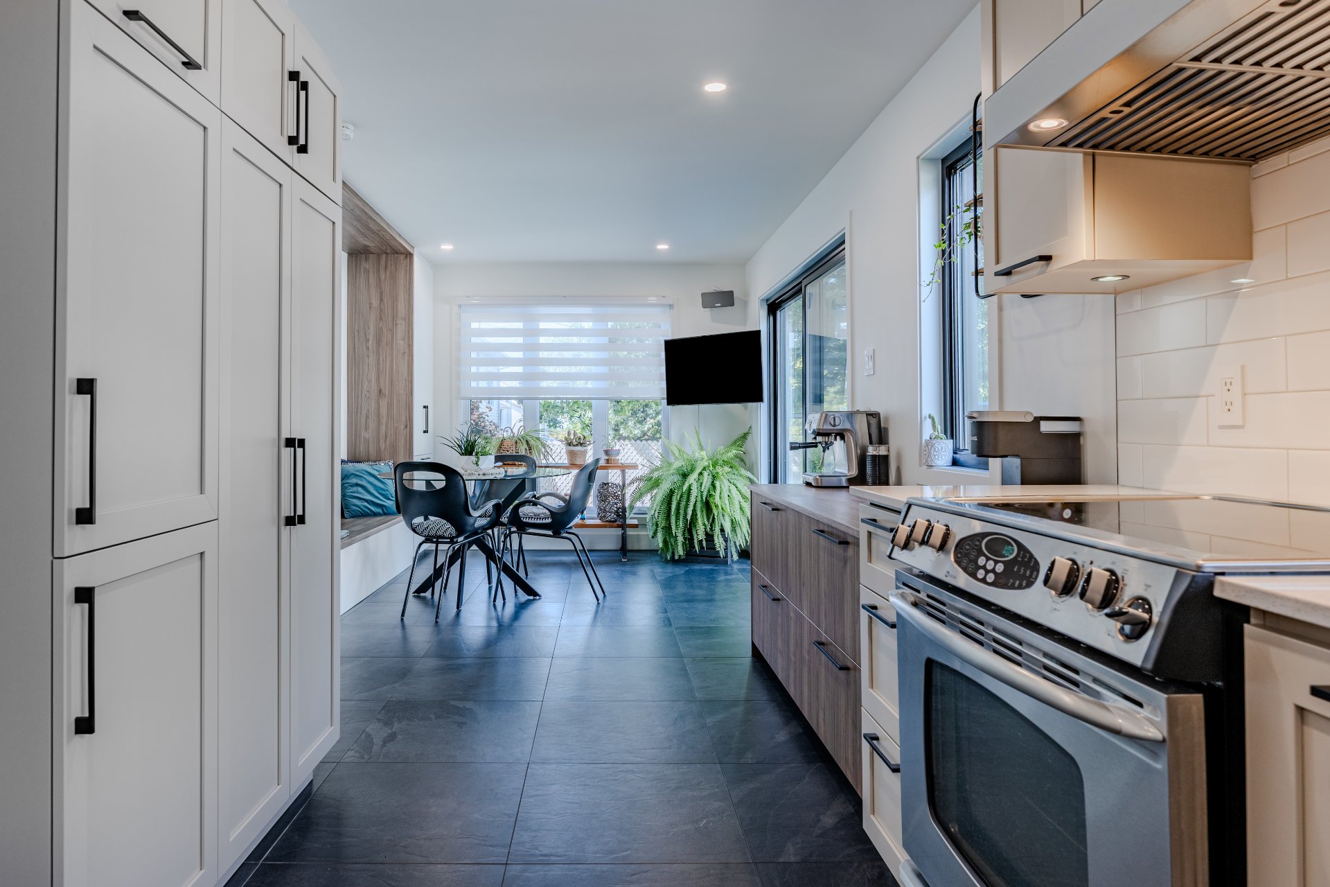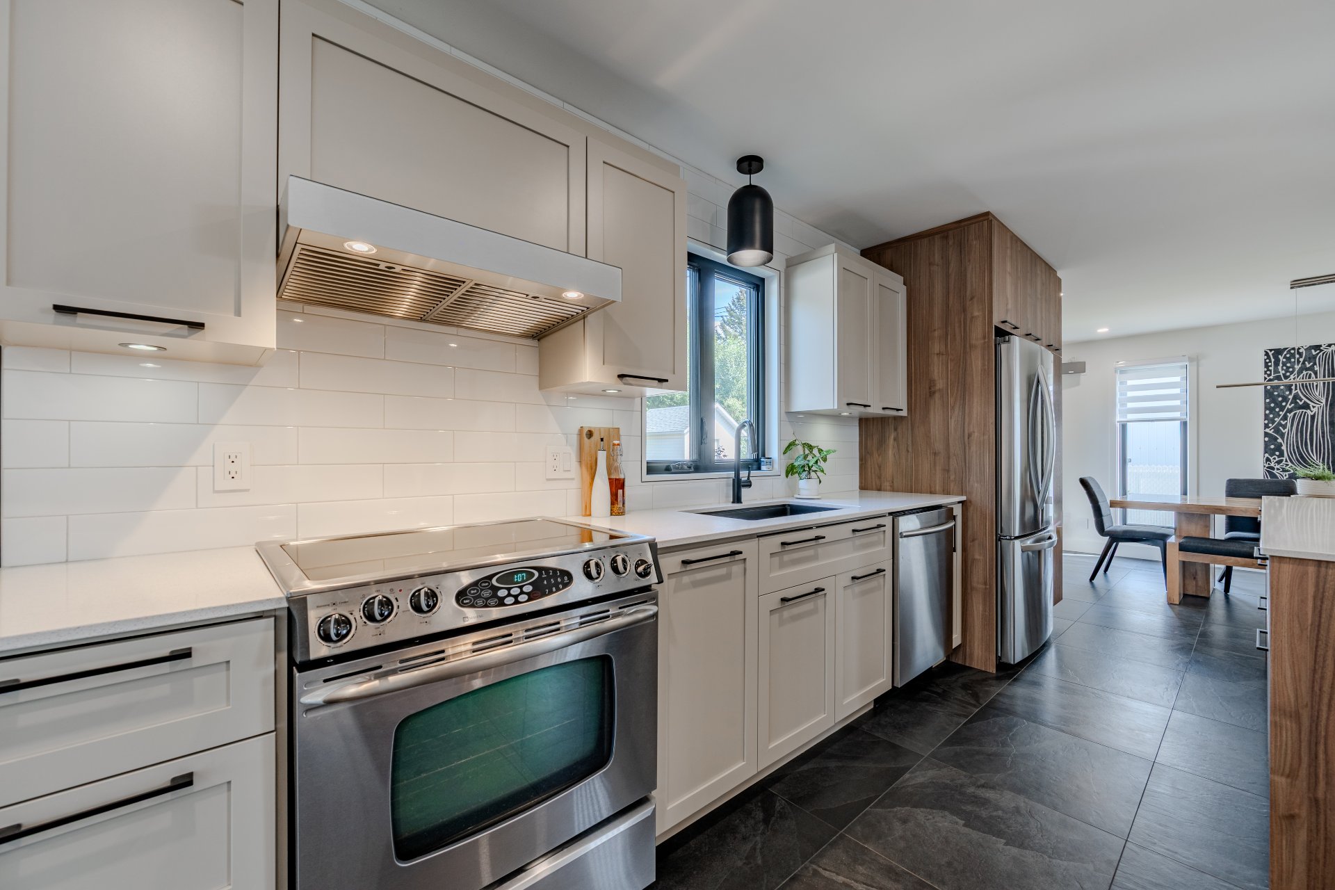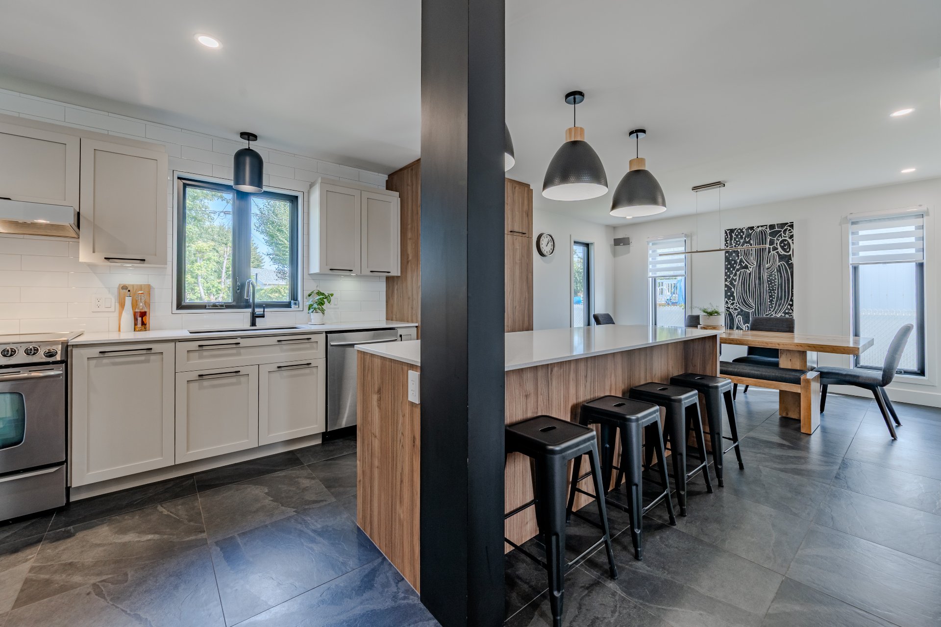 Aménagement intérieur * Palier supérieur : 4 chambres sur un même niveau, dont une suite des maîtres avec walk-in et salle de bain privée. Deuxième salle de bain complète avec douche moderne et bain autoportant. Garde-robe de type penderie avec chute à linge intégrée menant directement à la salle de lavage au sous-sol. * Palier d'entrée : vaste hall avec garde-robe et salon lumineux doté d'une vaste fenestration, d'un plafond cathédral et d'un foyer à bois (2023) dans un manteau de brique élégant. * Palier cuisine / salle à manger : espace moderne avec cuisine rénovée, comptoirs en quartz, îlot central, salle à manger, coin dînette et salle d'eau. Planchers chauffants sur tout le palier. Grande porte-patio de 8 pieds donnant accès à la cour arrière.