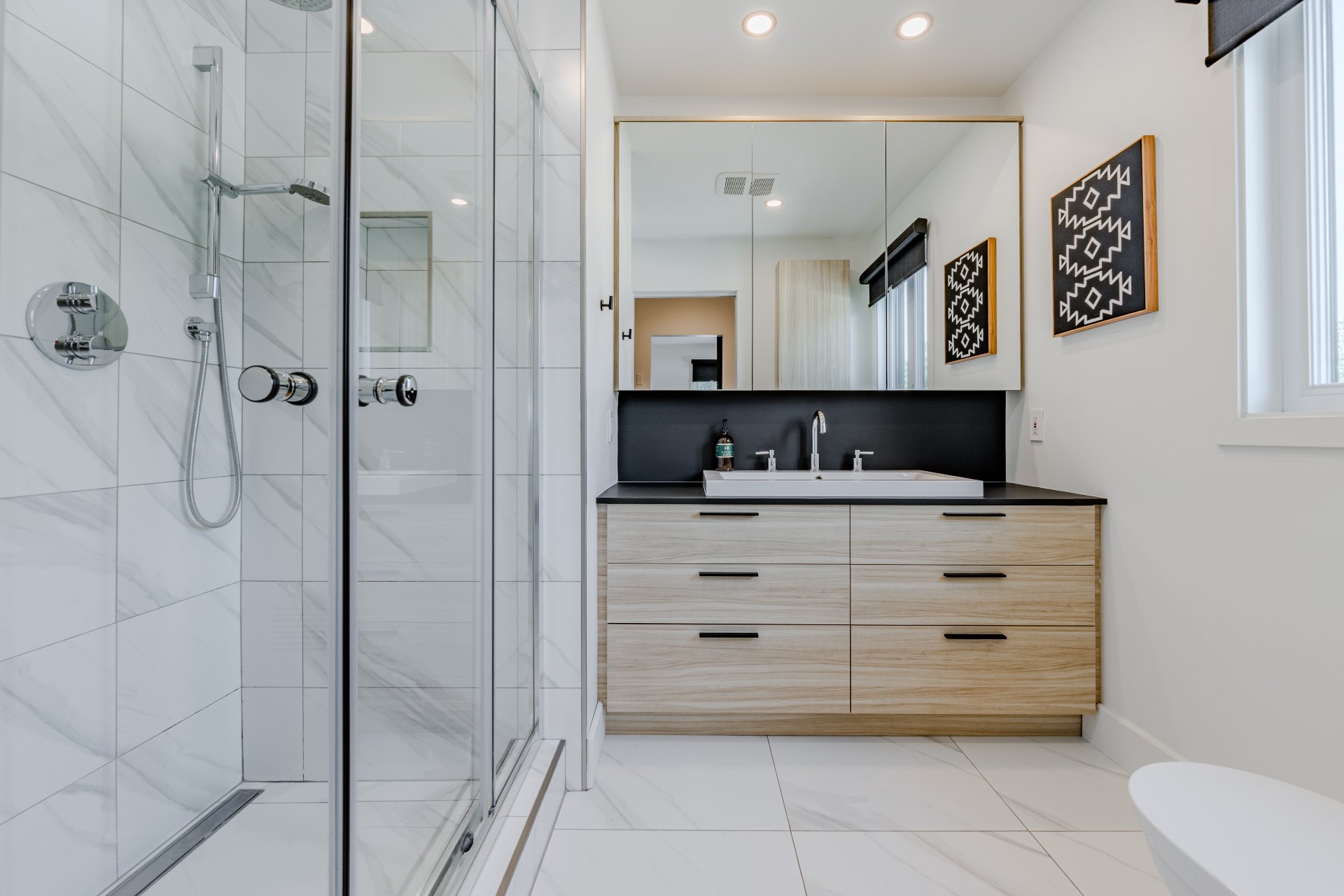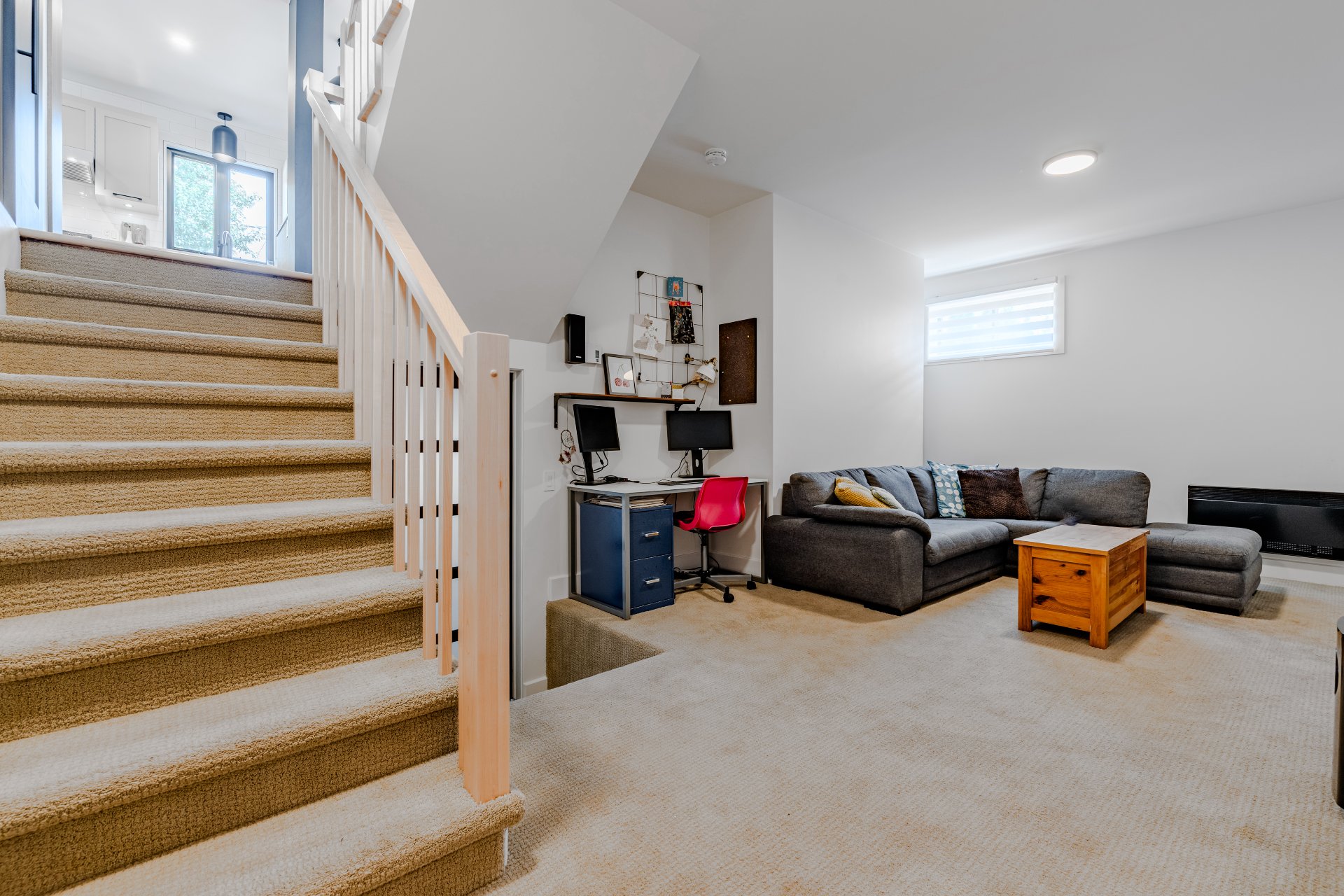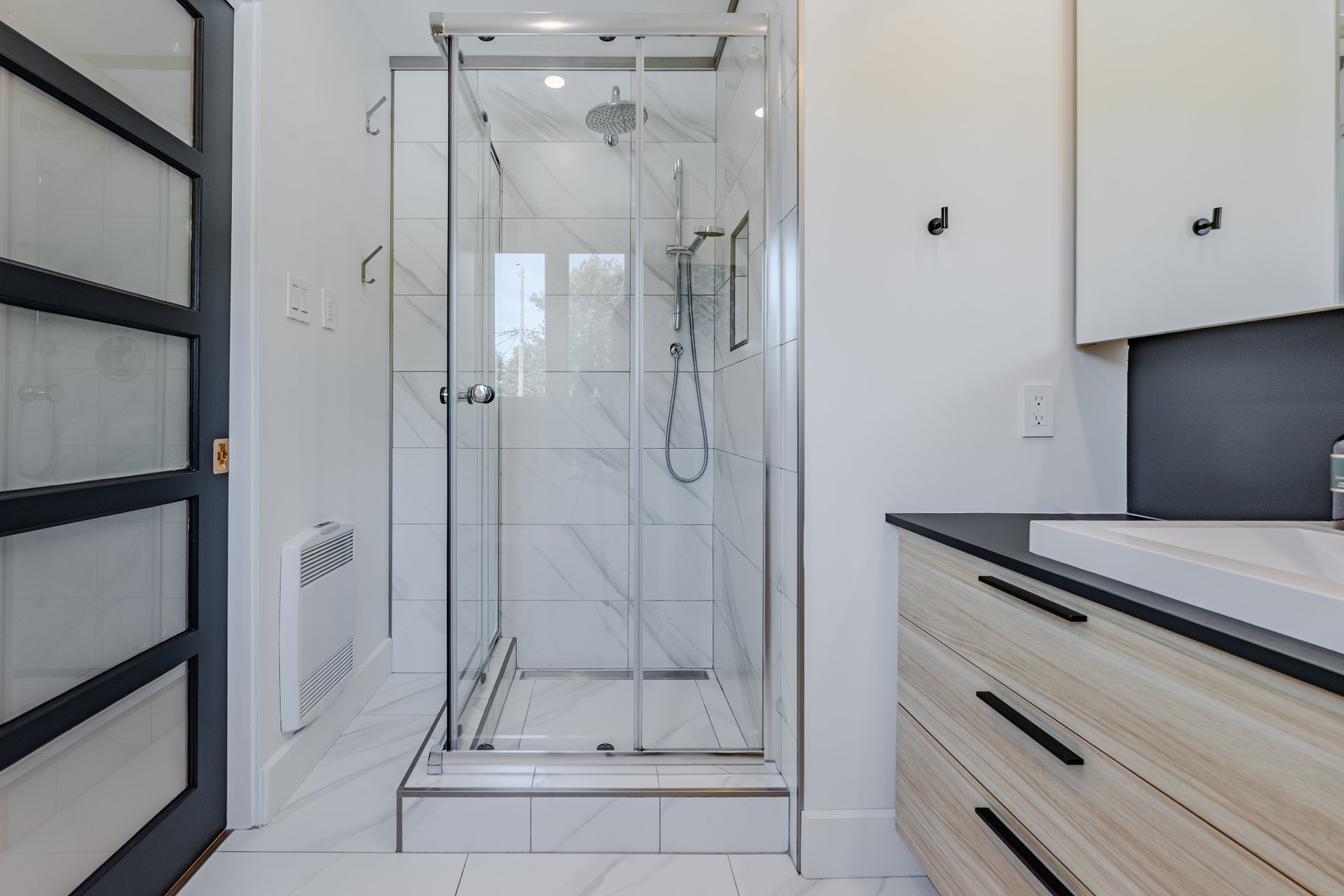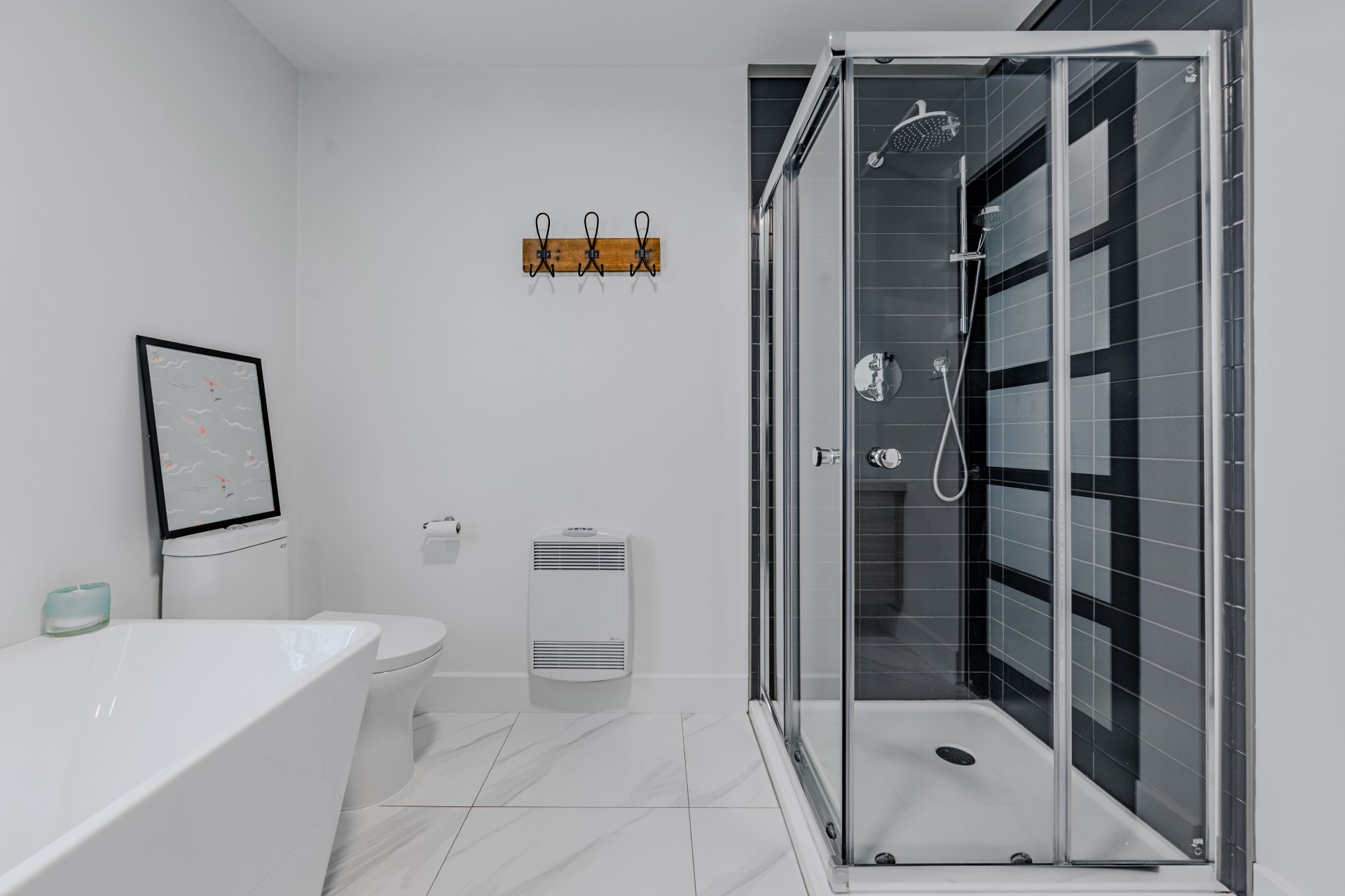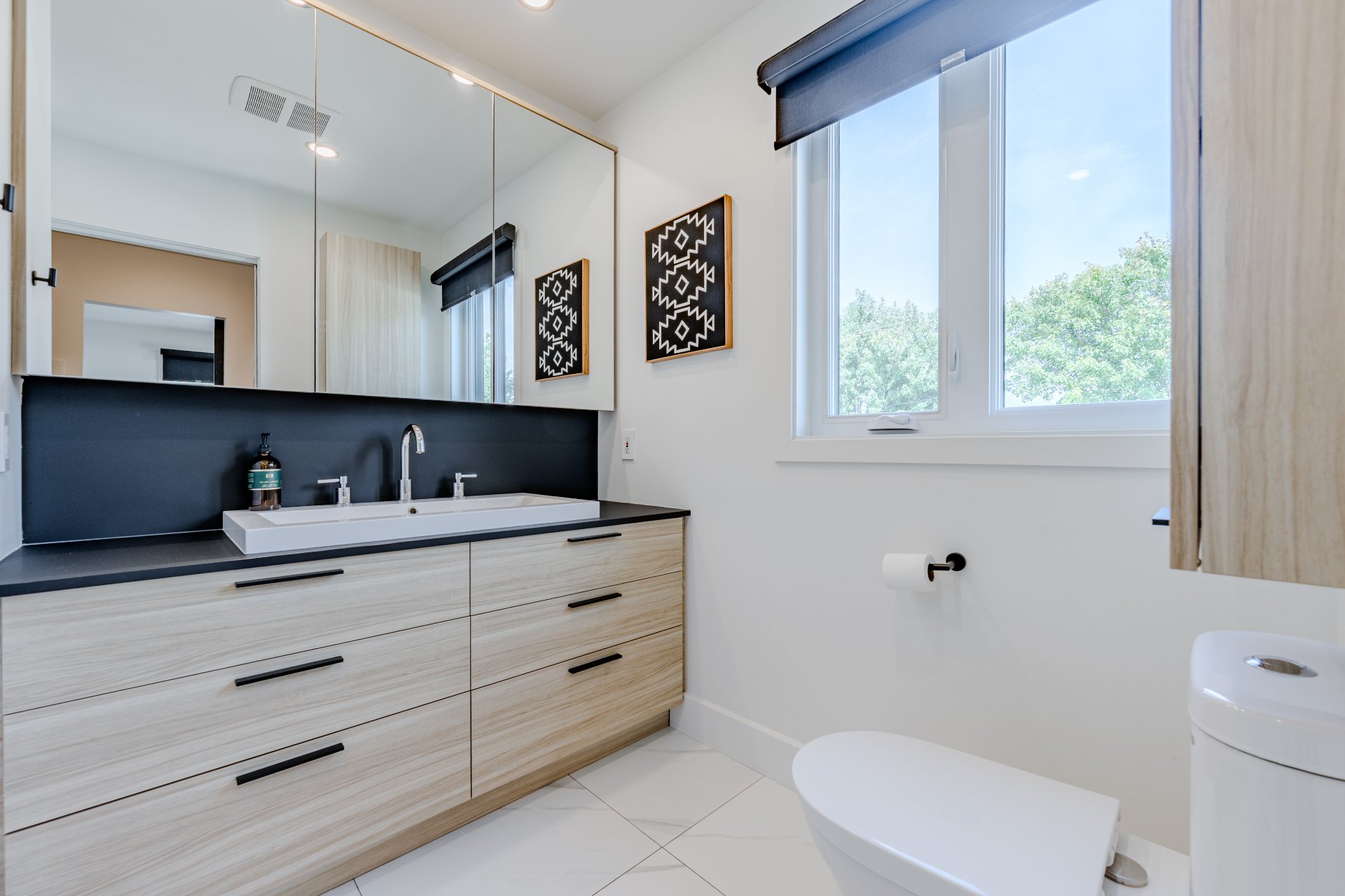 Aménagement intérieur * Palier supérieur : 4 chambres sur un même niveau, dont une suite des maîtres avec walk-in et salle de bain privée. Deuxième salle de bain complète avec douche moderne et bain autoportant. Garde-robe de type penderie avec chute à linge intégrée menant directement à la salle de lavage au sous-sol. * Palier d'entrée : vaste hall avec garde-robe et salon lumineux doté d'une vaste fenestration, d'un plafond cathédral et d'un foyer à bois (2023) dans un manteau de brique élégant. * Palier cuisine / salle à manger : espace moderne avec cuisine rénovée, comptoirs en quartz, îlot central, salle à manger, coin dînette et salle d'eau. Planchers chauffants sur tout le palier. Grande porte-patio de 8 pieds donnant accès à la cour arrière.